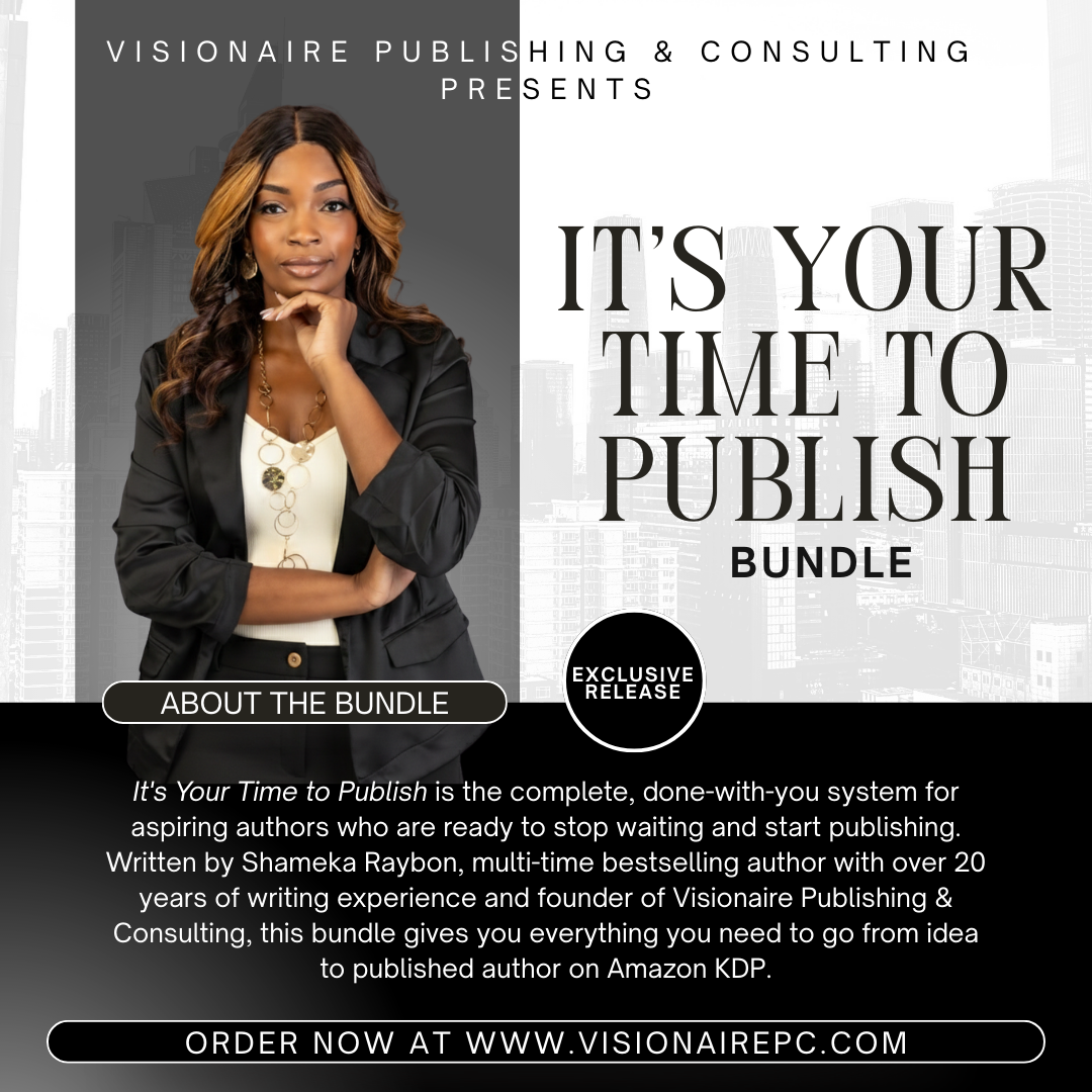 It's Your Time to Publish is the complete, done-with-you system for aspiring authors who are ready to stop waiting and start publishing. Written by Shameka Raybon, multi-time bestselling author with over 20 years of writing experience and founder of Visionaire Publishing & Consulting, this bundle gives you everything you need to go from idea to published author on Amazon KDP.